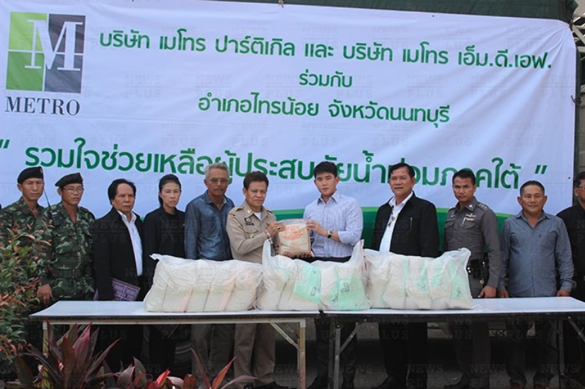 Khun Kanatach Piyasombutkul (Deputy Managing Director), Mr. Somyot Vichakorn (Sai Noi District-Chief Officer), Dr. Chaluay Khanjamnong (President of Khun Sri Subdistrict Administrative Organization), Khun Surasri Sri-insut (กำนัลตำบลขุนศรี) together with officials and employees of the Metro loaded 50,500 bags of 5 kg bags of rice total 252,500 kg on the truck to transport these rice bags to flood victims in southern provinces in Nakhon Si Thammarat.
